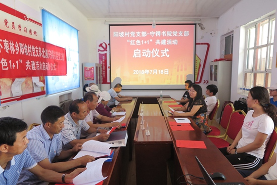 》,为深入学习贯彻习近平新时代中国特色社会主义思想和新时代扶贫开发战略思想,突出红色基因结对总基调,7月18日上午,中阳县阳坡村党支部-北航守锷书院党支部“红色1+1”共建活动启动仪式在阳坡村党支部党员活动室举行,共建双方党支部党员及入党积极分子共22人出席,启动仪式由阳坡村第一书记冯维成主持。