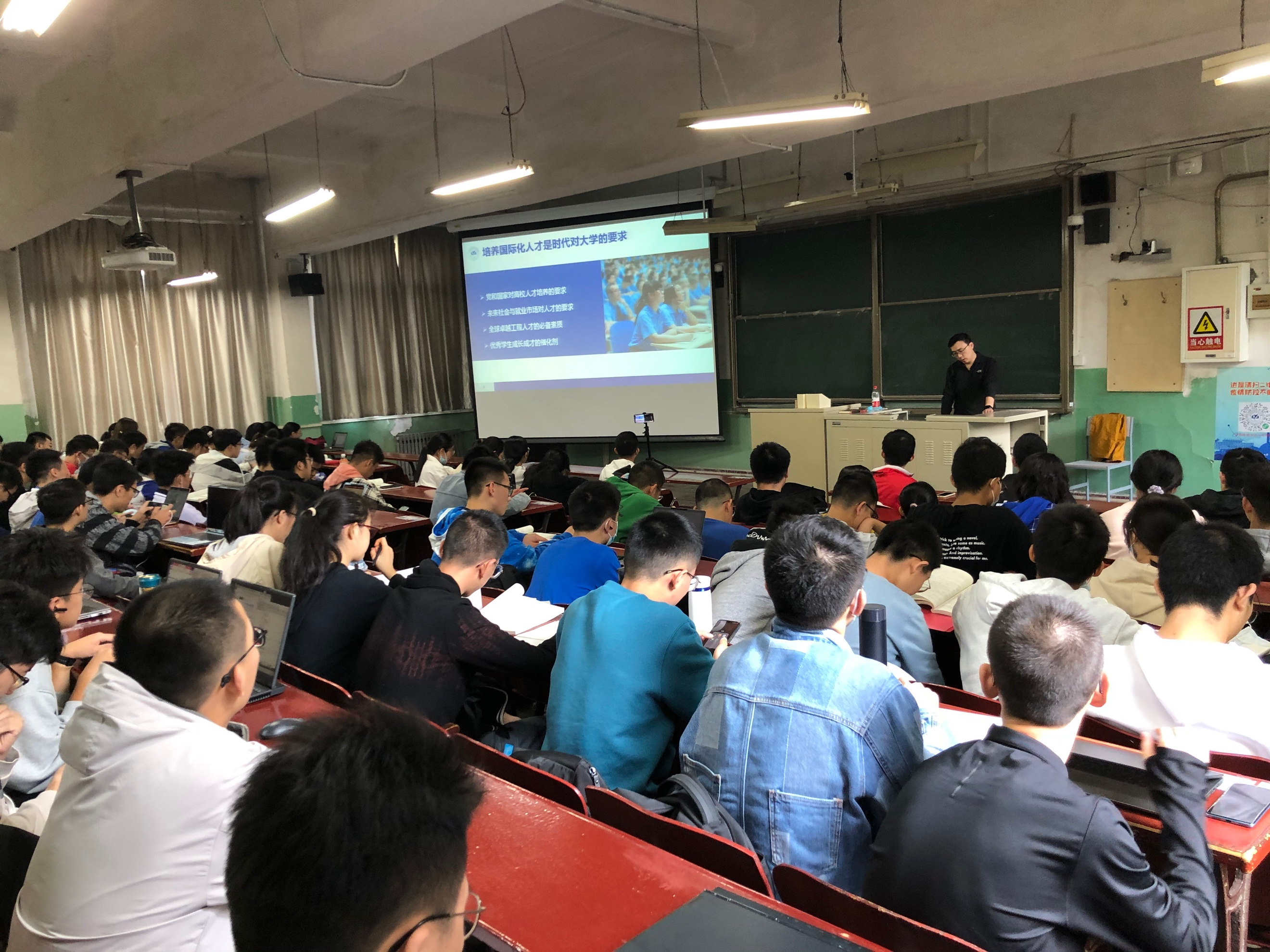 主讲人高源从培养国际化人才是时代对大学的要求谈起,向同学们讲解了近年来党和国家对高校人才培养的要求、未来社会与就业市场对人才的要求,同时引入了全球卓越工程人才的必备素质,帮助同学们在大学生活中找准自己的定位及未来发展方向。讲座中,高源详细介绍了北航的“UPS国际化发展战略”以及领军领导人才所需的全球胜任力。他通过实例向同学们介绍了北航目前的国际交流现状以及政策,帮助同学拓宽未来发展道路。