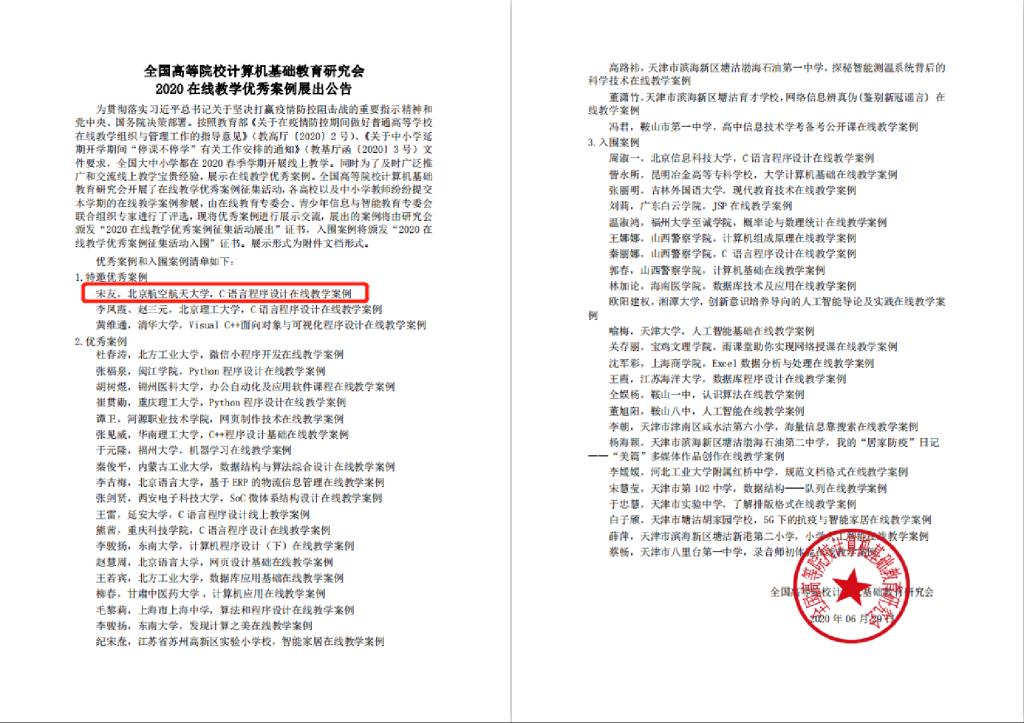 全国高等院校计算机基础教育研究会是我国有重要影响的、专门从事高校计算机基础教育研究的全国一级学术团体,对我国高校的计算机基础教育起到重要的推动作用。其为及时推广与交流线上教学宝贵经验,组织开展了在线教学案例评选活动。