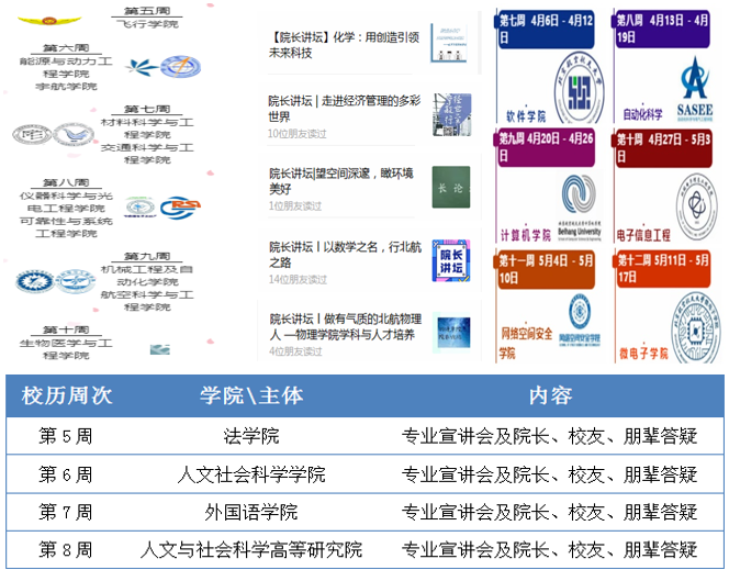自校历第5周至第13周,各专业学院轮番出场,开展精心策划的线上交流活动,帮助学生对各学院进行系统深入了解的同时,向学生传递了关爱之心,传承了北航人空天报国的爱国精神、责任担当。