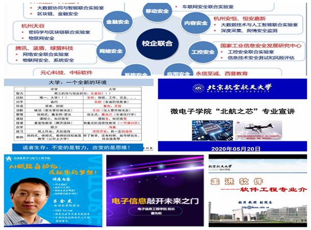 和各专业学院结合远程教育模式开展了丰富多彩的线上专业宣讲活动,包括院长论坛、院士讲座、微信群答疑、家长答疑、主题沙龙、实验室“云参观”、微信推送悟空影院介绍