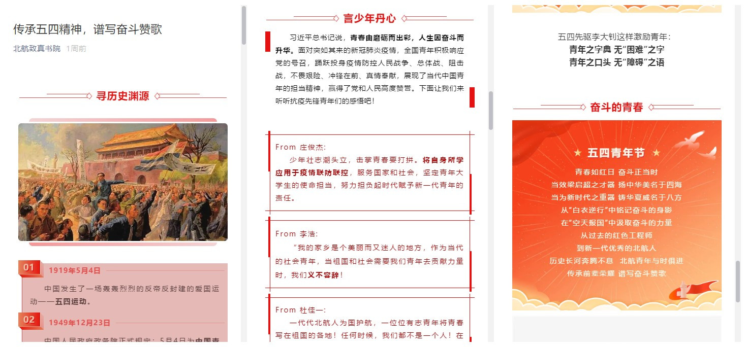 党建工作坊与守锷书院党建工作坊联合举办了“追忆百年逐梦之旅,共克时下战役之艰”主题演讲比赛。参赛者们追忆过往,联系实际,讲述了北航人的使命担当。同学们还以手写接力的形式,表达了自己对五四运动的怀念以及对未来的展望,立志成为与时俱进、不忘初心、有担当、有抱负的新时代的青年人。
