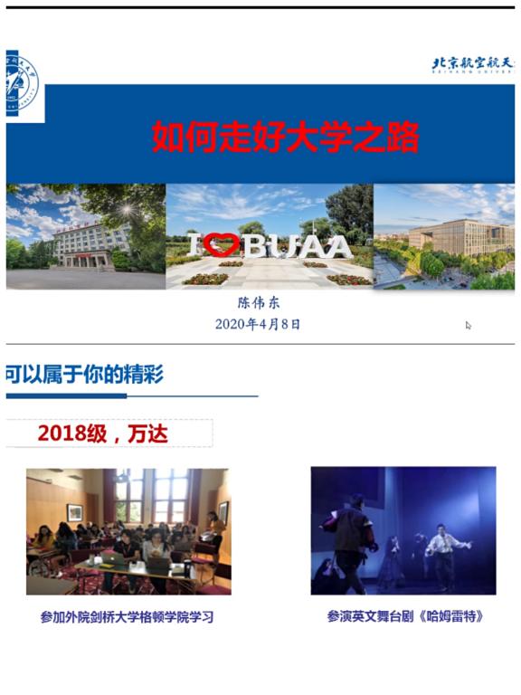 魏浩东同学就“做一位外院人是怎样的体验”这个话题展开了讨论。他认为在外院学习是一个活泼而又严肃的过程。在介绍了自己的学习经历后,他分享了自己的心得,他表示失败并不可怕,只要心怀梦想,就能战胜挫折;在大学生活中,学习很重要,亦要懂得放松。最后,他祝愿学弟学妹们能在北航选择热爱,拥抱可能。