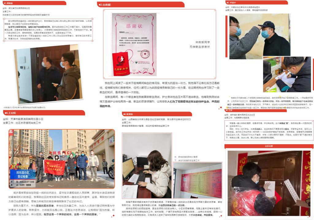 学子积极响应国家和社会“全民抗击疫情”和“返乡大学生回社区(村)报到”的号召,在这场严峻的考试面前挺身而出、担当奉献,充分展现了新时代中国青年的精神风貌。党支部结合学校相关部署以及“雷锋月”,落实党员号召,弘扬雷锋精神,组织全体党员和入党积极分子学习《习近平给北京大学援鄂医疗队全体“90后”党员的回信》,并积极宣传自愿加入防控志愿队伍的志愿者、无私奉献的献血者,以及到各级单位“报到”的共青团员的先进事迹。通过学习,大家深刻体会到年轻一代人的建设伟大祖国,为中华民族伟大复兴而奋斗的使命担当,决心刻苦学习,做有理想、有本领、有担当的新时代青年,让青春在党和人民最需要的地方绽放绚丽之花。