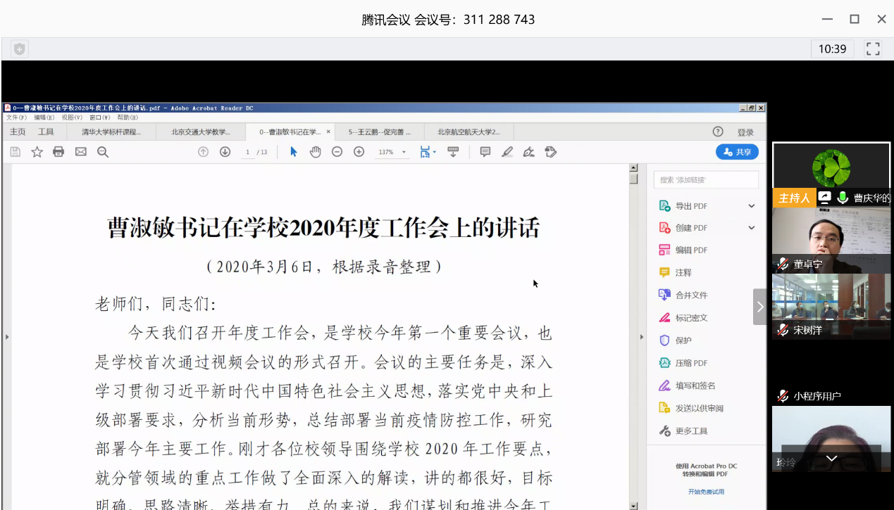 以视频会议形式,召开全体教职工会议,传达和学习学校工作会议精神和2020年度工作要点,对学院工作作出部署,提出要求。学院常务副院长曹庆华、常务副书记董卓宁等全体班子成员,学院全体工作人员130余人参加会议。会议由曹庆华主持。