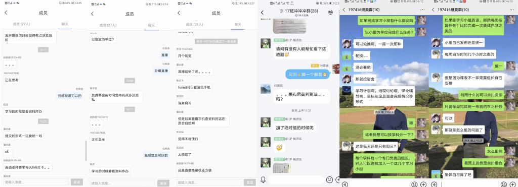 各团支部根据分团委新学期部署要求,结合当前线上“教”与“学”实际情况,“凝聚青春正能量,众志成城抗疫情”为主题,在团课后召开团员大会,开展班风学情民主研讨,组织制定线上学习的“一班一策“。全体团员群策群力,精心讨论设计集体攻略,做到“一支部一特色”“全员参与,全员覆盖”,引导全体学生“相互帮助,携手守望”。197411团支部以宿舍为单位结组,成立学习小组开展互帮互助。197418团支部以集体打卡塑造班级学风,以小组交流开展个性探索,通过“点面结合”的形式,相互监督促进集体良好学风。197421团支部制定答疑计划和资源共享计划,班团干部带头执行。197426团支部制定“早晚计划”,早起晨读打卡,晚上利用Forest习惯养成软件,以建立房间集体“种树”的形式“云”监督全体晚自习。