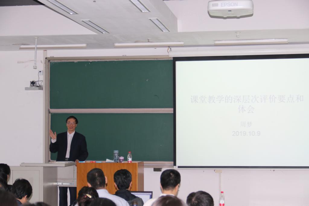 第二部分由代数大类核心课程群任课教师周梦教授主讲,周梦教授和参会人员分享了课堂教学的深层次评价要点和体会,分别从课堂教学内容的组织、课堂教学中的素质熏陶、课堂教学内容的启发式自然引入、教学过程的思路引导、教学内容和要求的层次递进、一些细节性要求六个方面展开详细介绍,分享了自己从教多年的宝贵经验,他通过讲解教师授课的三个层次,对参会人员如何评教进行了深入指导。