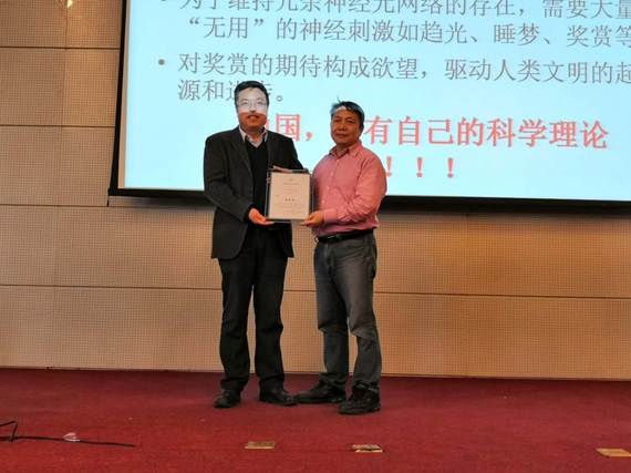然后,报告进入正题,唐业忠研究员向大家解释了脑容量膨大的意义和神经网络与神经元网络。接着,针对动物和人都能够瞬间记住突发事件,但与记忆直接相关的突触的形成却需要较长时间这一逻辑矛盾,他提出了冗余神经元网络这一理论。为了维持大脑里大量的冗余神经元网络,人和动物就渴求各种刺激,包括内外刺激的输入。这就很好地解释了达尔文理论也无法解释的人类的玩耍行为、睡梦、成瘾、自杀、同性恋、爱情、艺术和宗教等现象。同时,对奖赏刺激的期待构成欲望,驱动人类文明的起源和进步。