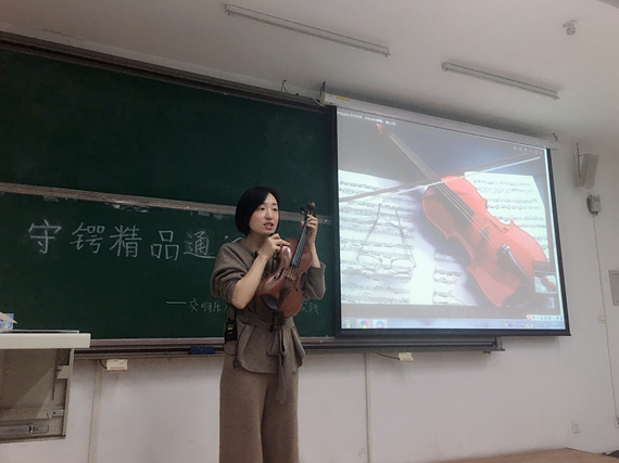 3月7日晚上,由孟中男老师主讲的《交响乐入门与小提琴艺术实践》课程顺利开课。课上,孟老师从交响乐的演奏乐器开始为同学们一一介绍与交响乐有关的“西洋”乐器,从弦乐到管乐,从小提琴到定音鼓,既让同学们对小提琴和交响乐有了更多的认识,又把原本略显枯燥的教学内容变得十分活泼有趣。在叙述了交响乐使用的乐器之后,同学们开始接触小提琴,从介绍小提琴的部件,再到学习如何持琴,如何持弓。虽然有的同学是第一次接触小提琴,但在老师的教导下也很轻松的上手了小提琴。