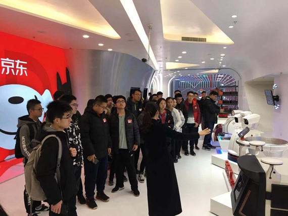 接下来,师生们来到了京东集团总部参观。京东自提点、提货柜、无人超市,首先带给大家巨大的科技感和视觉冲击。步入多媒体展厅,在中国最大的360度LED屏前,同学们通过视频了解了京东集团的发展历程、发展规模和运营模式。各式各样的京东无人叉车,无人分拣机器人,无人机向我们展示了京东科技创新实力和优势。通过大屏幕上实时更新着每日零点起的下单量,购买者男女比,购买喜好,热搜品牌,抢手的国际品牌商品等大数据智能统计信息,同学们对大数据的市场应用有了更深层次的理解。