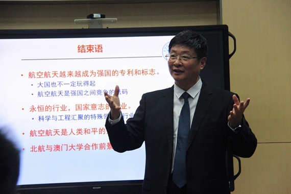 最后,杨超院长展望了未来的航空航天技术,一张张充满科幻美感的未来航天器概念图极大的激发了学生对于未来空天事业发展的兴趣。更大,更快,更小,智能化,无人化……种种航空航天未来的发展方向通过一个个详实的案例展现出来。杨超院长深情讲到:“航空航天越来越成为强国的专利和标志,是科学与工程汇聚的、永恒的行业,是人类和平和发展的关键基石之一。”他向师生介绍了北航在航空航天发展过程做出的贡献,展示了北航深厚的工科基础;也表达了对澳门大学的深厚文化底蕴的钦佩,希望北航与澳门大学开展更加深入的合作交流,优势互补,为实现伟大中国梦共同奋斗。