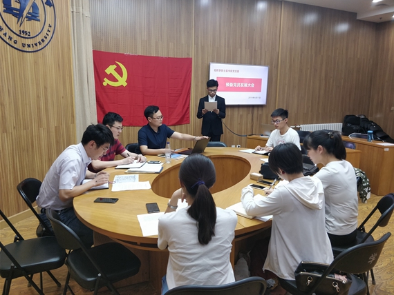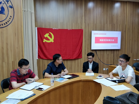 党支部在沙河校区雄鹰领飞工作中心大会议室举行发展党员大会,支部全体党员和重点发展对象曲星光同学参加会议,会议由支部书记冀赵杰主持。