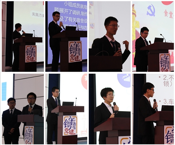 在答辩会过程中,党建工作坊的同学们分为八组,对自己的实践过程以及成果进行了详细的展示。同学们从自己日常生活中所遇到的各种问题入手,对校园食堂、共享单车、“僵尸车”现象、以及同学们的宿舍生活情况等方面问题提出了自己的思考与讨论。同学们通过实地走访、问卷调查等多种形式进行了实践,并最终形成成果提案。旨在为提升沙河校区的校园环境以及改善同学们的学习生活环境做出自己的贡献。