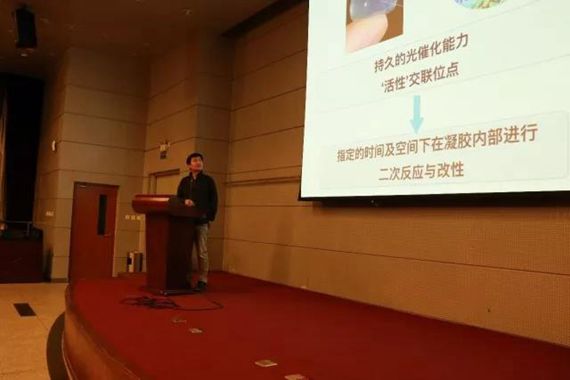 紧接着,刘明杰教授为同学们详细介绍了一系列具有高力学性能的仿生软体活性材料。这些材料在低温稳定的机械性能、高形变形状记忆特性和定向减震等等方面表现出了突出的特性,刘教授给我们展示了Aqua Material制作视频,列举了许多前沿尖端的仿生纳米科技,比如可以和任何凝胶粘在一起的水凝胶、生物医学器件-心血管支架。刘明杰教授还介绍到,在抗生物粘附、薄膜制备、柔性电子器件和致动传感器等方面的应用也正在被进一步探索。