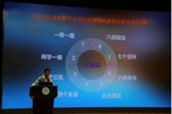 巩永丹老师授课的内容为“理论新飞跃,行动新指南”。巩老师围绕“一条主线”、“两个阶段”、“三个倡导”、“四个全面”、“五大理念”等关键词,重点解读了习近平新时代中国特色社会主义思想的“八个明确”和“十四个基本方略”。