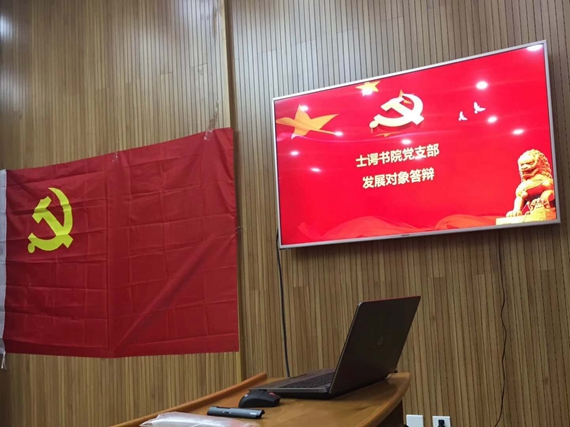 入党积极分子王诗琪和焦贤锋同志依次开始答辩,他们通过PPT展示的方式向党组织汇报了近一年的学习情况、社会工作情况,陈述了自己的入党动机以及对党的认识,最后分别选取了一则时事热点展开了分析,充分展示了他们良好的精神风貌和向党靠拢的意愿。