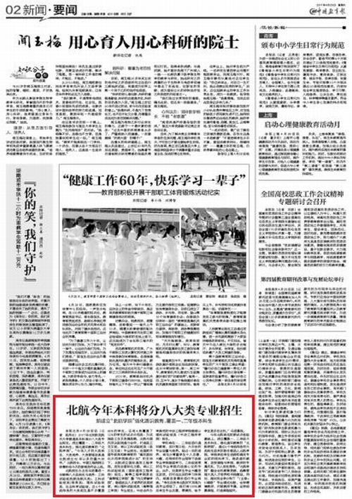 《中国教育报》2017年4月29日要闻版报道北航今年本科将分八大类专业招生: