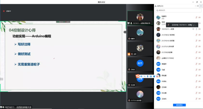 本次线上培训主要针对机器人及人工智能大赛应用类“全地形小车设计制作赛”赛项进行培训,邀请了在第二十三届比赛中获得全国一等奖团队段围与缪淞霖同学做经验分享,两位同学同时也是“创将工坊”社团的副社长和团支书,李烨、孙治博两位老师担任主持人,参加培训的同学共计22人。
