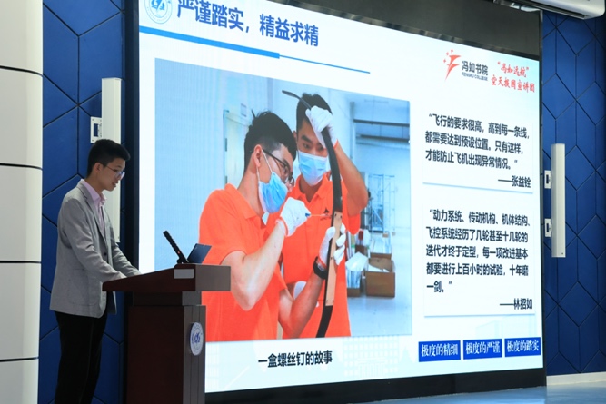 最后,宣讲团成员张峻彩以“冯如精神”为主题,为同学们带来题为《逢汝有梦,空天相传》的宣讲报告。报告以“冯如一号”“冯如二号”设计研发为脉络,讲述了“中国航空之父”冯如先生“创新、坚毅、爱国”的青春故事。报告还展现了北航人在新时代传承和弘扬冯如精神过程中的担当作为,“冯如三号”大学生创新团队并两次突破世界纪录,用实际行动践行青春使命,号召青年学子要接过时代接力棒,积极投身祖国空天报国事业,在服务国家需求中实现人生价值。