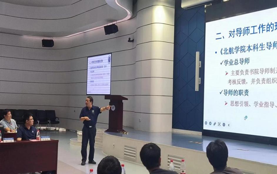 接着,学业总导师孟庆春进行了以“以课程学习为第一要务”为题的讲话,阐述了自己对于学业总导师、导师职责与北航导师工作四强模式的理解,强调导师工作应当集中在强情怀与强基础两方面。同时,孟庆春强调了本年度导师要开展总结工作,要求2023级导师根据导学内容、遇到的问题以及解决方案进行总结。