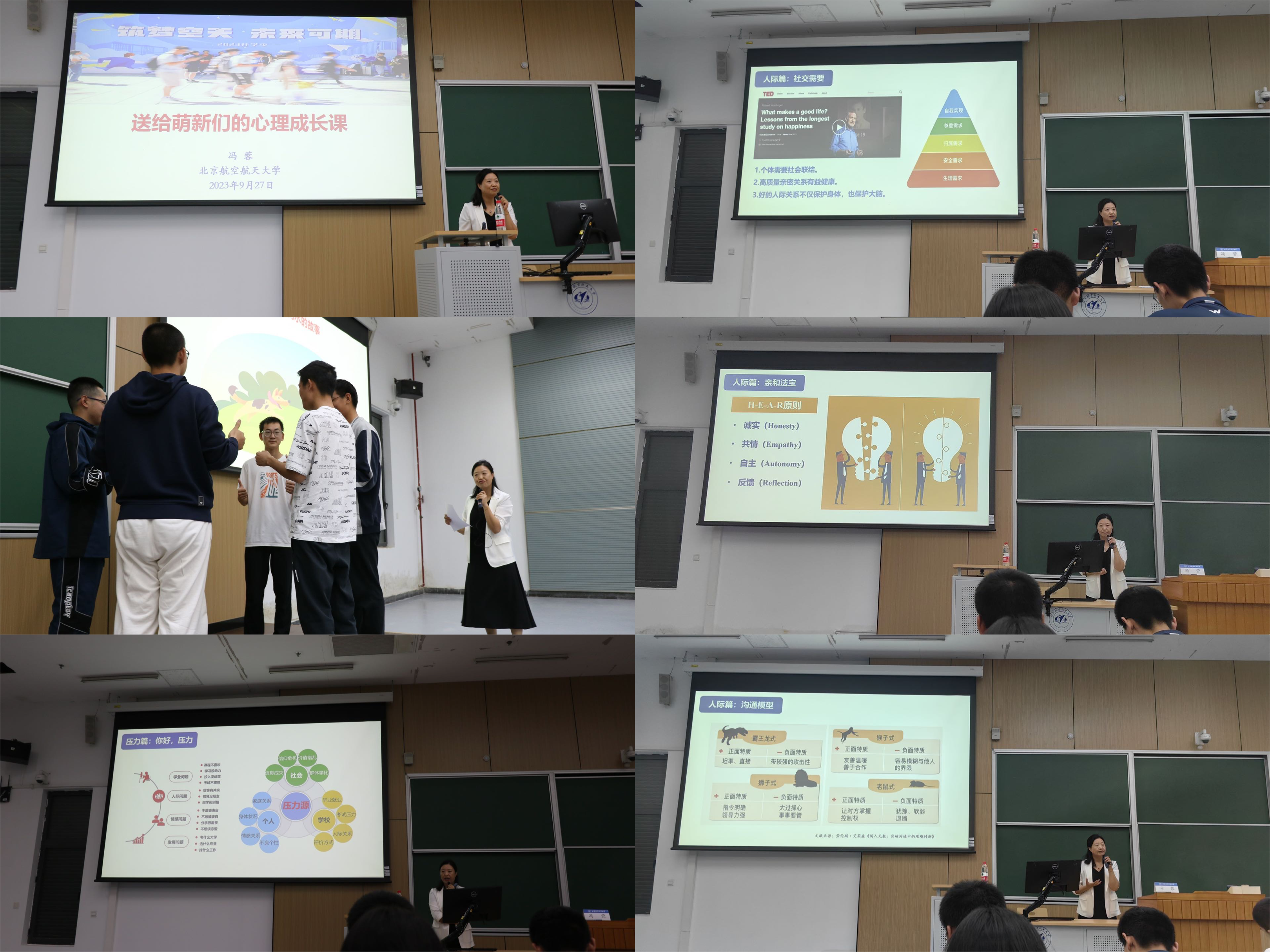 本次讲座冯蓉老师围绕新生适应常见问题,用一个个生动有趣的小游戏引入,从印象管理、沟通技巧、情绪觉察、压力调试等方面帮助同学们提高展现自我、提高共情与排解压力的能力以及合理设定目标。在人际篇,冯蓉老师讲述的亲和法宝HEAR原则(诚实、共情、自主、反馈)给了同学们很大的启发,四种沟通模型让同学们正确了解不同沟通方式的优缺点,达到良好的人际交往的目的;在情绪篇,冯蓉老师讲述了认识情绪和情绪的四大功能,并且通过银牌效应给同学们讲述合理预期,教会同学们改变认知,努力找到每一件事情的积极意义呢;在压力篇,冯蓉老师讲述了压力源并分享了解决压力的方法,即改变压力有害的认知、合理定位压力并挖掘压力背后的意义;在目标篇,冯蓉老师对人生目标的设定进行了详细的介绍与指导,鼓励同学们走出舒适区,为未来人生做准备。