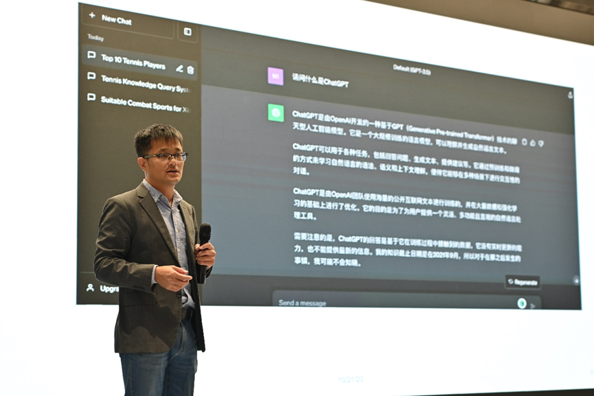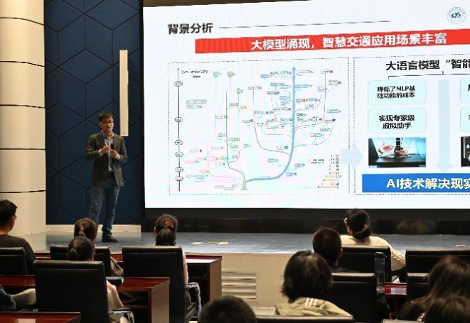 随后,张老师以电影中的人工智能交互为例,从专业视角逐步进行TrafficGPT结构分析,让听众对其工作原理、技术流程得到初步了解。他从基础能力、模糊需求、交通洞察三个角度展示了整体框架应用于复杂任务场景的能力,并严谨详实地介绍了TrafficGPT启发性决策辅助的强大功能。同时,他剖析了TrafficGPT未来在交通垂直细分领域的发展规模及规划,让同学们深入系统地认识未来行业的趋势,感受交通前沿科技的精微,体会人工智能时代大数据、大语言与生活的密切相关性。
