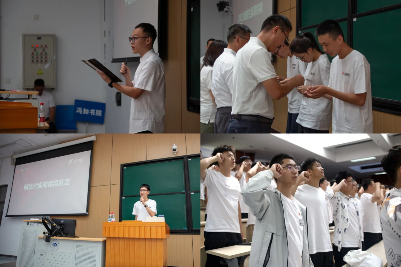 2025级新生代表周楷翔发言时,分享了自己与航空航天事业的不解之缘。他表示,将以开学仪式为新起点,快速适应大学学习生活,以冷静从容的心态面对学术挑战,以扎实的专业知识武装自己,始终牢记 “空天报国” 的初心,努力成长为能担大任、可堪重用的空天人才。发言最后,周楷翔带领全体2025级新生庄严宣誓,铮铮誓言铿锵有力,展现出冯如学子勇担使命、逐梦空天的坚定决心。