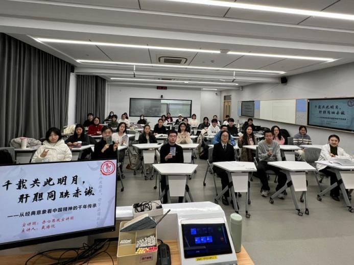 “赤心思政宣讲团”开展“千载共此明月,肝胆同映赤诚”主题宣讲活动。宣讲团成员戴博悦聚焦“月”这一中华文化意象,以诗词为媒、时代为景,通过意象鉴赏和互动导学相结合的方式,引导学生在文化溯源中筑牢信仰根基、涵育家国情怀。
