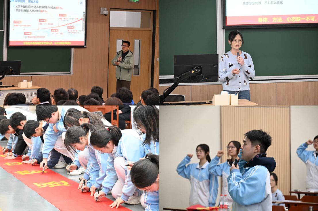 专职辅导员许政作招生宣讲,围绕学校办学历史、学科特色、人才培养及书院制育人模式等内容进行了介绍,帮助同学们进一步了解北航的育人理念与发展平台。随后,首都师范大学附属中学毕业生、北航学生代表尹思博结合自身成长经历,分享了高三备考经验和大学学习生活体会,并从学习方法、心态调整、目标规划等方面与学弟学妹们进行了交流,鼓励大家坚定信念、科学备考,以扎实行动迎接高考挑战。
