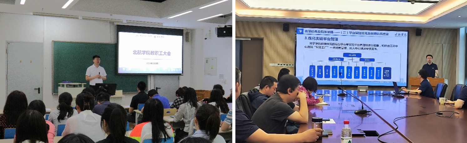 召开全院教职工大会,深入学习贯彻学校2024年人才培养大会精神和校院两级管理体制改革工作推进会精神,学院党委书记宋晓东、院长刘虎共同传达了学校人才培养大会精神,并宣贯学院综合改革方案初稿。