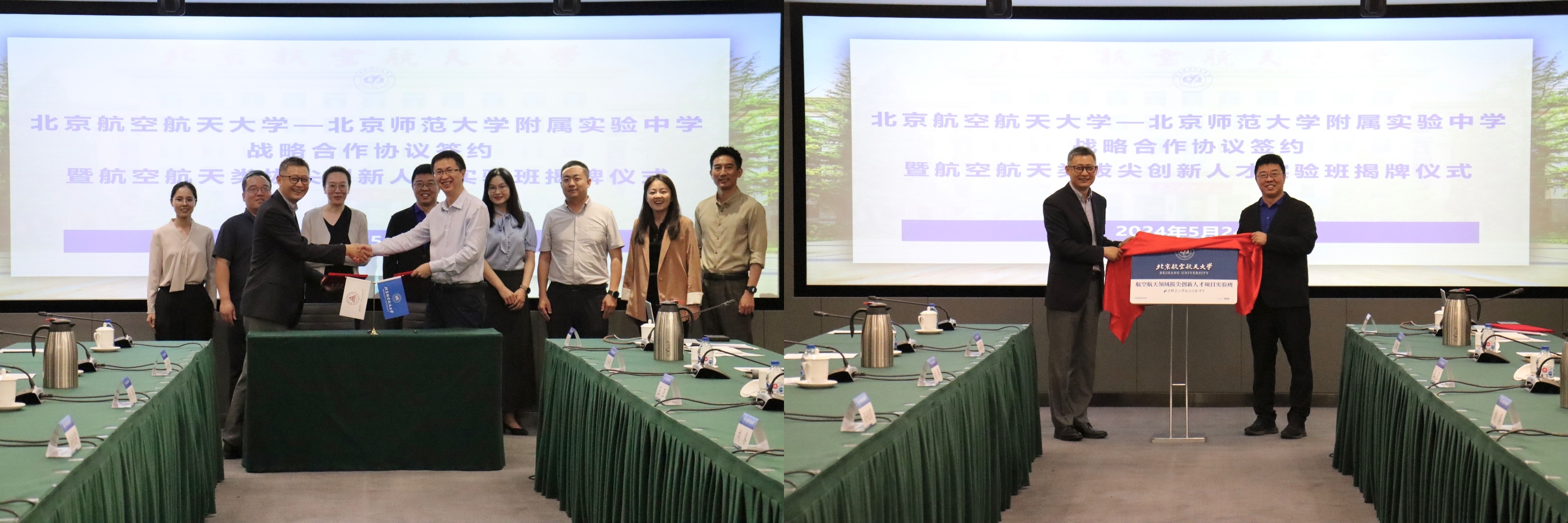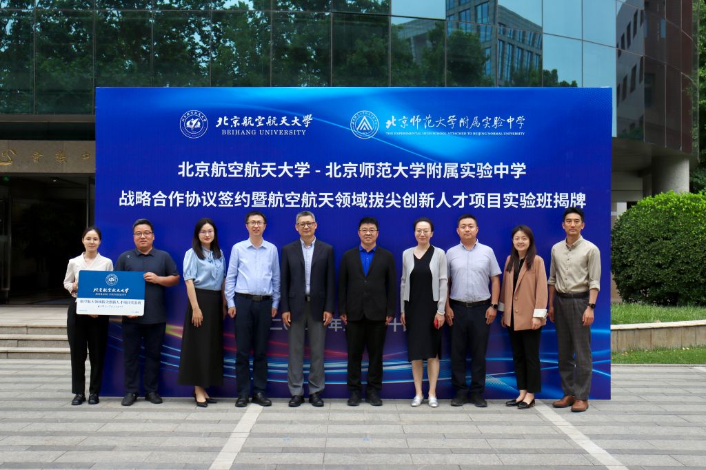 —北京师范大学附属实验中学创新人才实验班”揭牌。双方本着“优势互补、合作共赢、人才共育”的原则,整合各自优势资源,创新高校与中学联合人才培养模式,将大学航空航天特色和中学人才培养需求有机衔接,在科技创新实践、拔尖创新人才培养等方面深度融合、双向奔赴,为实现拔尖创新人才大-中贯通培养探索新途径新模式,为建设教育强国、科技强国和人才强国作出更多更大的贡献。
