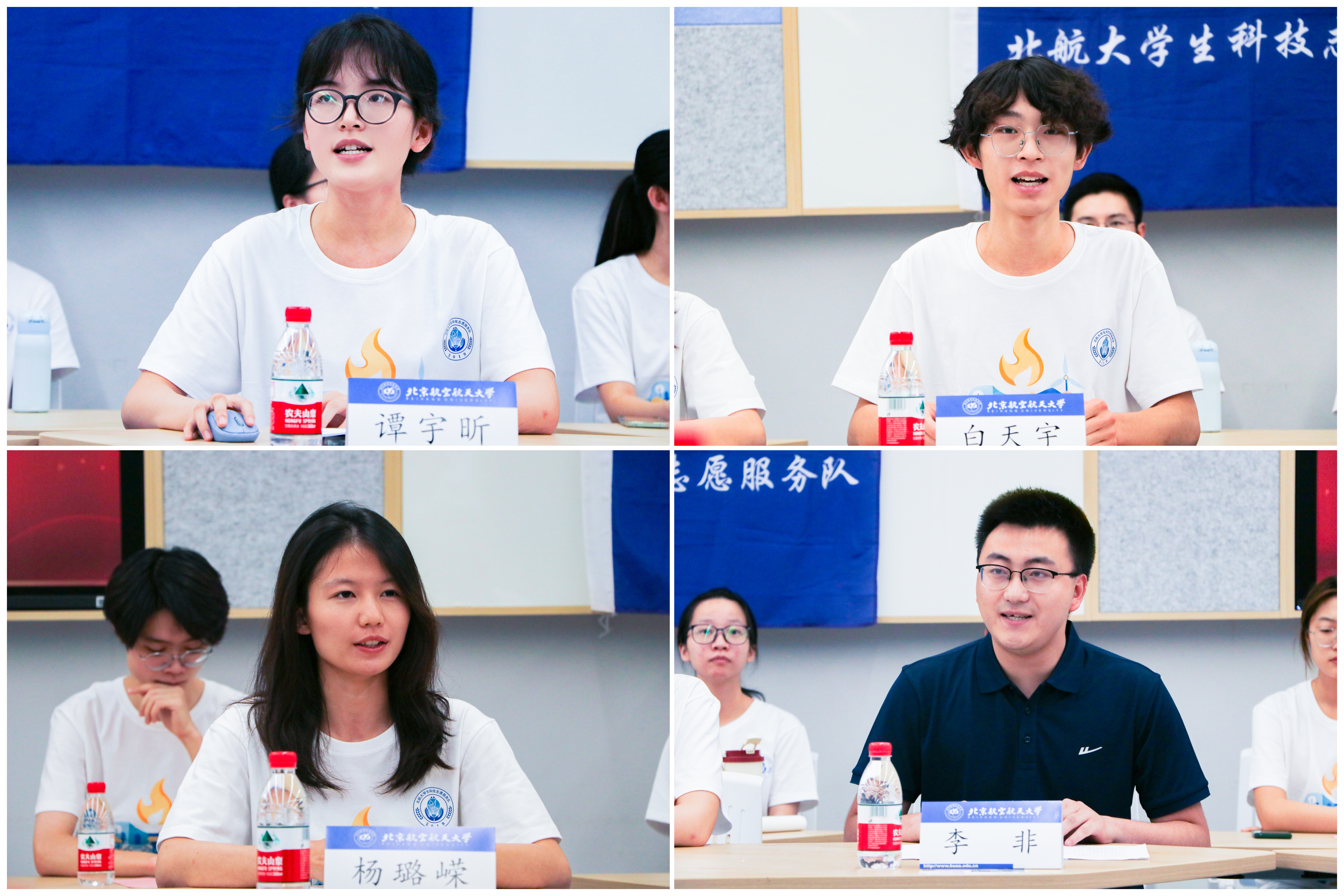 志愿服务队队员代表谭宇昕、白天宇、杨璐嵘分别从大学生和中小学生的双向陪伴、课程参与者到课程负责人的成长蜕变、科普观察者到科普讲授者的实践思考等三个维度,讲述了在北航大学生科技志愿服务队中的成长故事。