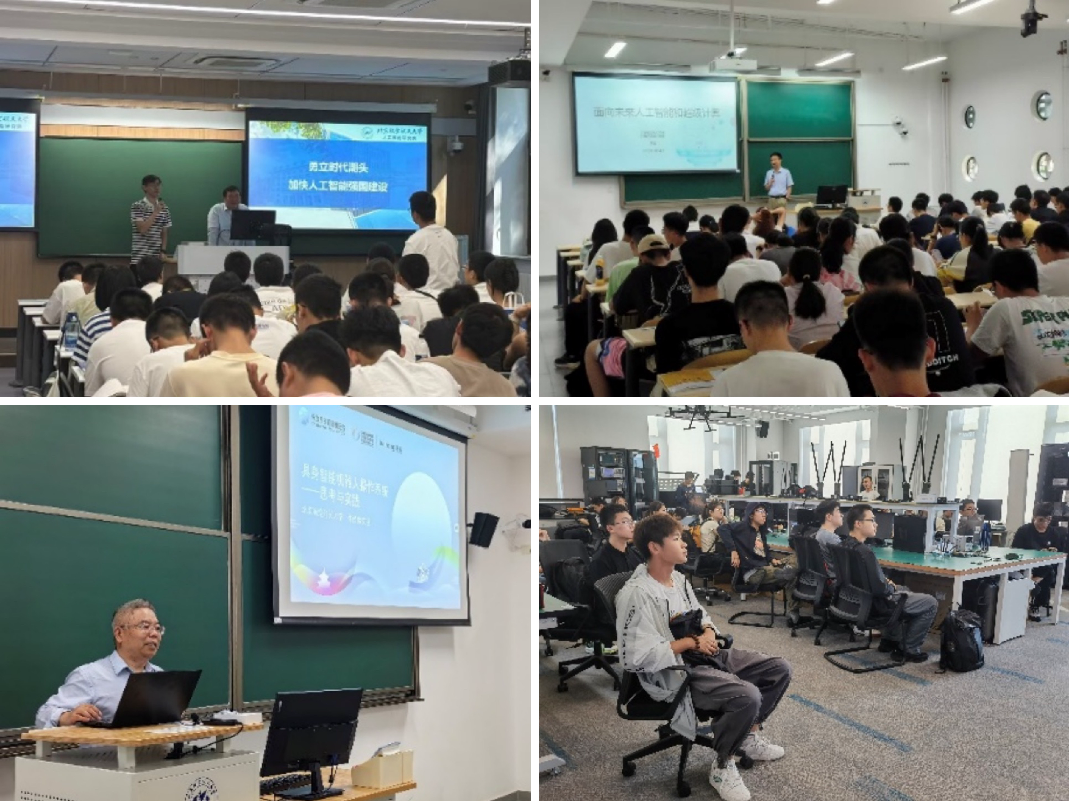 与培养方案,牛建伟、盛律、于茜、张晶四位老师分别分享了具身智能与机器人融合、大小脑协同模型、大模型赋能矢量图与草图理解、多模态大模型驱动Web UI Agent等前沿技术。网络空间安全学院高年级学生带领一年级新生参观各类实验室,沉浸式体验网络空间对抗与舆情管控的实战场景,近距离感受AI社交机器人账号的存在与舆情引导原理。人工智能学院(人工智能研究院)吴文峻老师以图灵测试等案例阐释了AI的概念与能力并回顾发展历程,强调了需求、算法、算力协同的重要性,重点介绍学院五大方向以及取得的重大成果,并向同学们介绍了学院以基础理论为核心、结合多领域技术与应用的育人体系。
