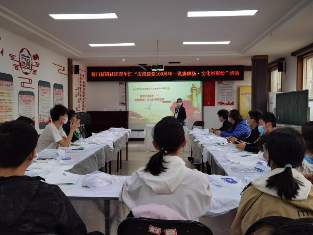 组织志愿服务队伍来到蓟门新语社区参加蓟门新语社区青年汇“庆祝建党100周年——党旗飘扬·文化衫彩绘”活动。志愿者一行人怀揣着对党的热情,用铅笔勾勒出各式各样灵动的底稿,再用不同的色彩赋图案以灵魂,同学们各显神通,陆续完成各自的“大作”,创作出了属于自己的“建党百年”文化衫。