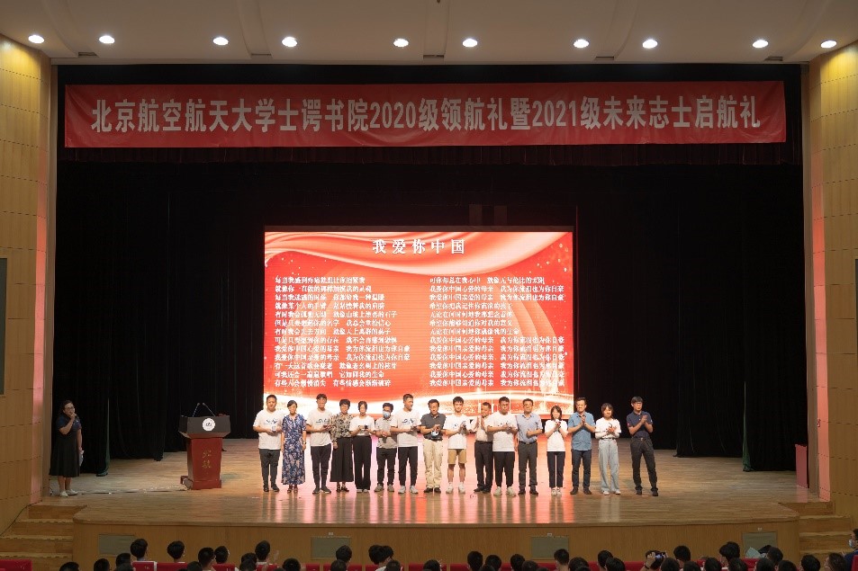 仪式最后,信息大类专业学院领导为新生代表佩戴书院院徽。仪式在全体新生齐唱《我爱你中国》的歌声中结束。