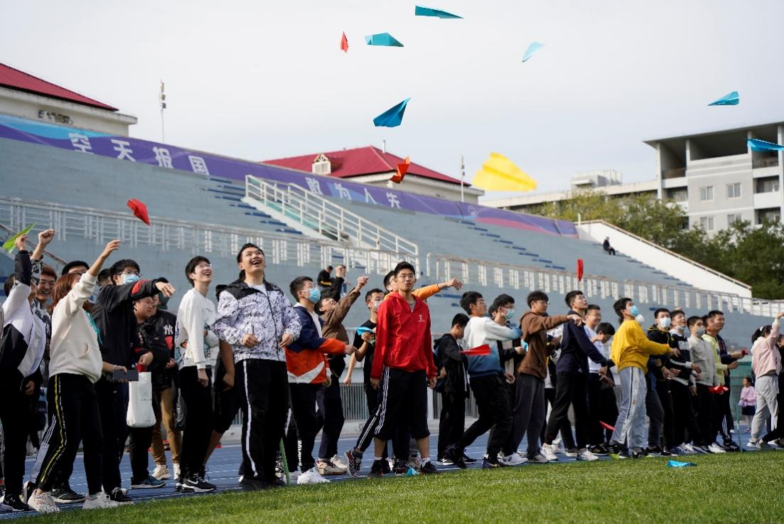 “1、2、3,飞!”伴随着主持人的指令,近100个纸飞机从操场一侧起飞,天空中纷飞的各色纸飞机与“空天报国,敢为人先”的口号交相呼应,构成了一道美丽的风景线。纸飞机环节的结束标志着趣味运动会的开始。