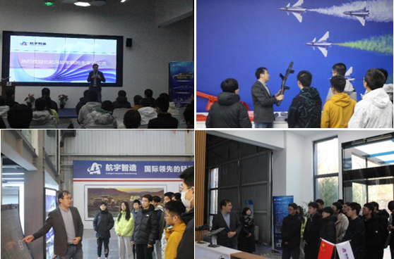 首先,程鹏志博士带领同学们参观了企业展厅,介绍企业发展历程及创新成果,细致地讲解轻量化制造技术在航空、汽车领域的应用,以及企业核心项目在市场上的优势地位。之后,程博士为同学们详细分享了他的求学经历与创业经验。从大一时申请专利到博士期间创业,从研究航空领域到飞机、汽车双行业产品研发,程博士不断地向自己发起挑战。他把对科创的态度和思考放在精彩的创业故事中娓娓道来,给予同学们很大的启发,为同学们更新了对“大学学习”认知的深度与广度。