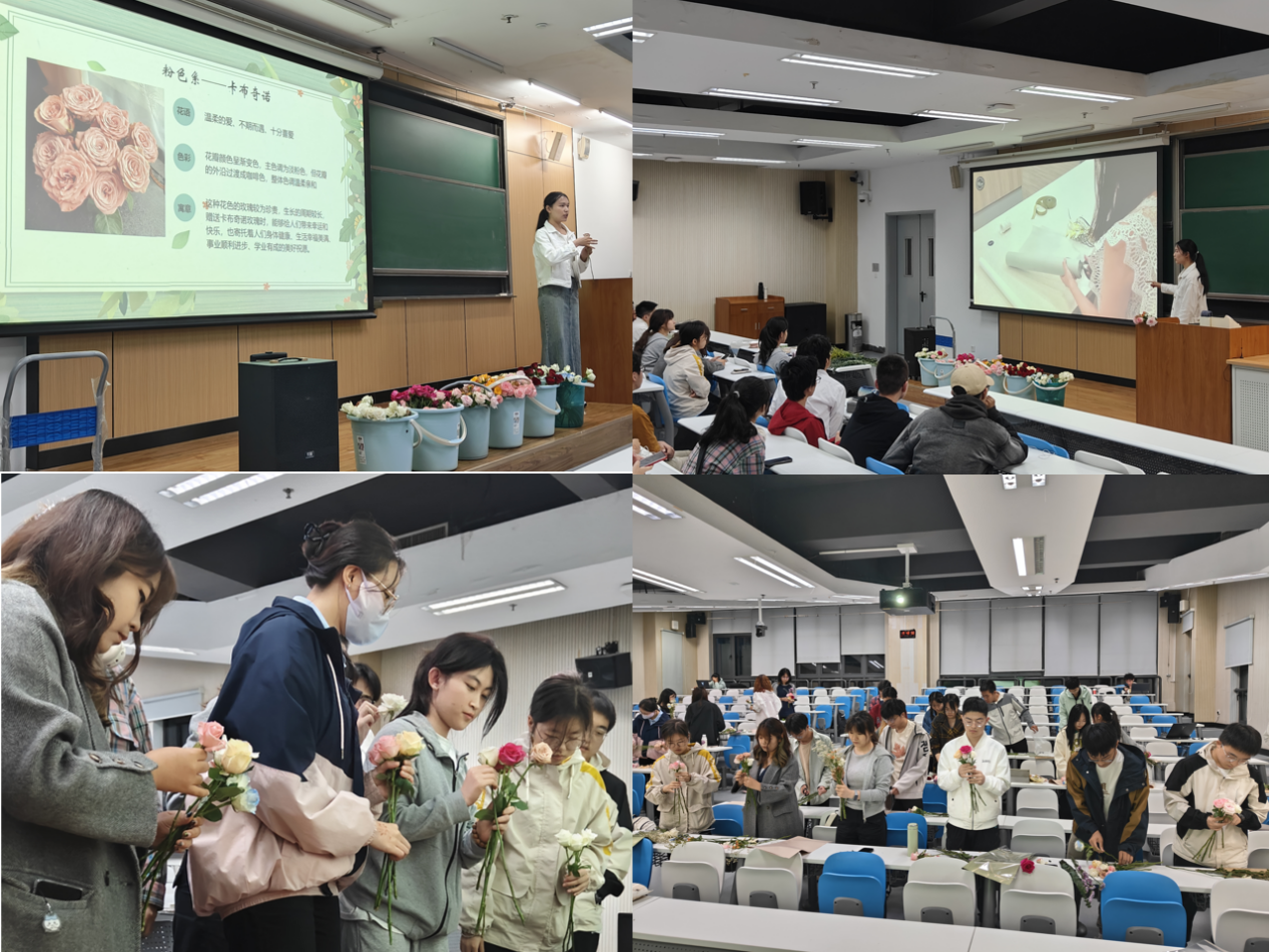郭文祺详细介绍了多种花材的特点与寓意,并讲解常见的生活花束搭配技巧与使用场景。在学姐的引导下,同学们纷纷动手实践,在古典钢琴名曲中开启了一场属于自己的创意与表达。
