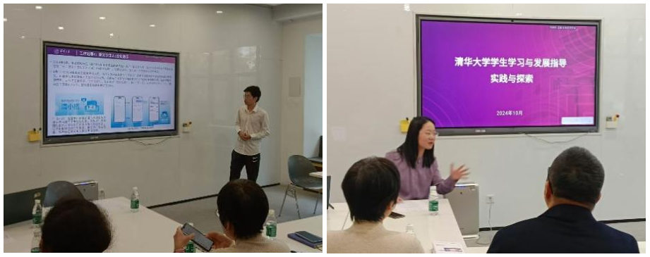 18日上午悟空影院 执行院长丁丁一行3人、北京工业大学学业指导中心办公室主任韩天玉一行3人、深圳职业技术大学学生处处长王敏坚一行6人前往清华大学学生学习与发展指导中心进行调研。中心副主任詹逸思老师首先对清华大学学生学业支持工作进行了整体概括,之后由邬丰骏老师对学生学习与发展指导中心工作体系以及目前重点工作进行了介绍,重点介绍了AI+促进学生发展的创新。随后,与会人员就AI与学业支持工作的结合以及清华目前学业支持工作体系进行深入交流。会后,一行人参观了清华大学“一站式”学生社区。