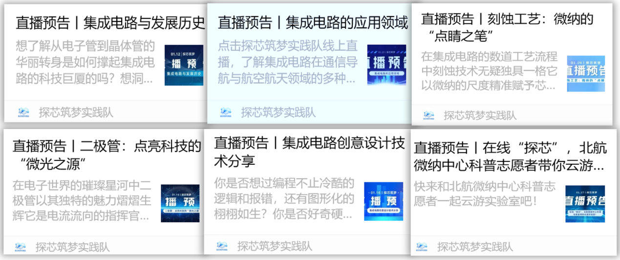 探芯筑梦实践队围绕集成电路的宏观发展、核心技术、创意实践及云端体验四大模块,编写了10篇系统完整的课程材料,构建起“观,技,创,云”直播体系。《集成电路发展与历史》《刻蚀技术》《在线探芯》……“主播们”通过生动的语言、丰富的案例和直观的云游实验室环节,让观众深入了解集成电路的全貌、核心技术与实际应用。