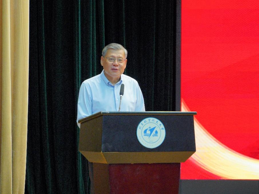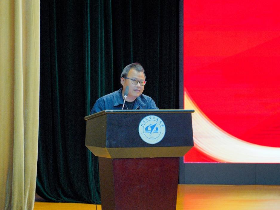 院长刘志新在启航礼上讲话。刘志新对197名问天者表示热烈的欢迎和衷心的祝贺。他介绍了九三阅兵中“大国重器”背后彰显的北航力量,并希望同学们弘扬“家文化”,营造互助氛围,同行携手成长,收获满满的认同感、幸福感和使命感;传承“好学风”,深化专业认知,夯实数理基础,筑牢学术成长和科研启航的根基;凝聚“正气旋”,厚植家国情怀,锚定发展向位,将个人理想融入中国式现代化的宏伟蓝图。