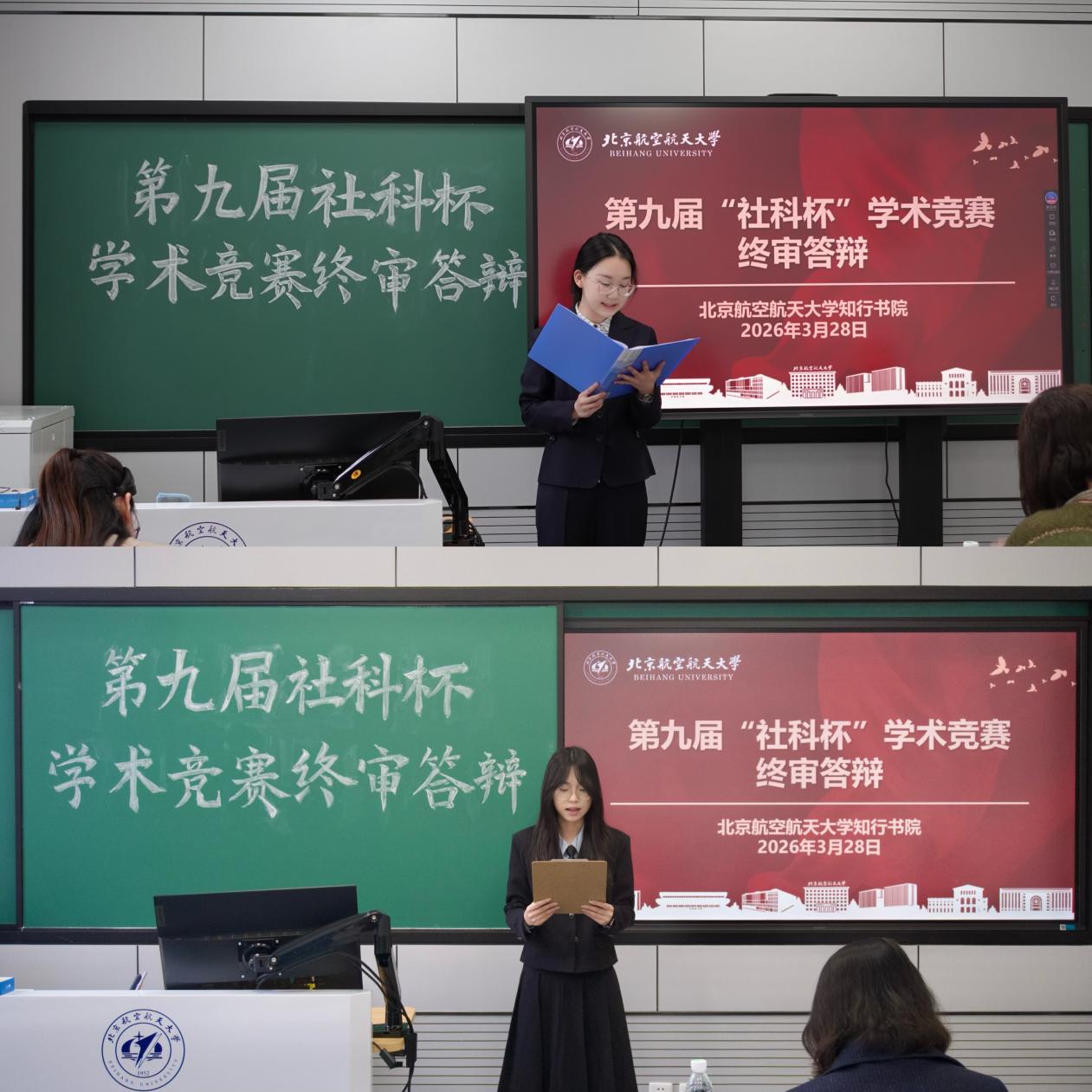 第九届“社科杯”学术竞赛终审答辩在学院路校区主南204、主南206教室举行。各参赛队伍围绕人工智能、基层治理、数字法治等社会热点与现实问题开展研究。答辩现场,学生通过PPT展示、数据分析、案例展示等形式汇报研究成果。评委针对论文的研究方法、学术规范和逻辑结构进行提问与点评,肯定学生在选题立意、实地调研方面的投入,同时就样本代表性、方案可行性、数据来源等方面提出具体修改建议,帮助同学们掌握科学的研究方法,为进一步开展学术研究打下坚实基础。