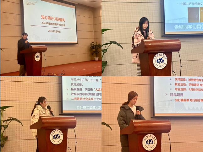 首先,任道安带领同学们回顾了秋季学期的北航生活:从入学的军训历练,到学业的不断进步;从赤心党建活动,到文体青春风采,鼓励同学们在新学期继续奋勇前行,取得更好的成绩。随后,张子怡介绍了新学期博雅教育相关内容,希望同学们提升综合素质和艺术素养。朱昕瑶讲解了科创竞赛以及社会实践相关安排,鼓励同学们积极参与科技竞赛与社会实践公益活动,实现个人的全面发展。在学业方面,芦田介绍了新学期的学业发展规划,希望同学们能够结合自己未来的发展规划做出适合自己的专业选择。随后,芦田提醒同学们在校注意消防安全和人身安全,谨防诈骗,善用网络平台。