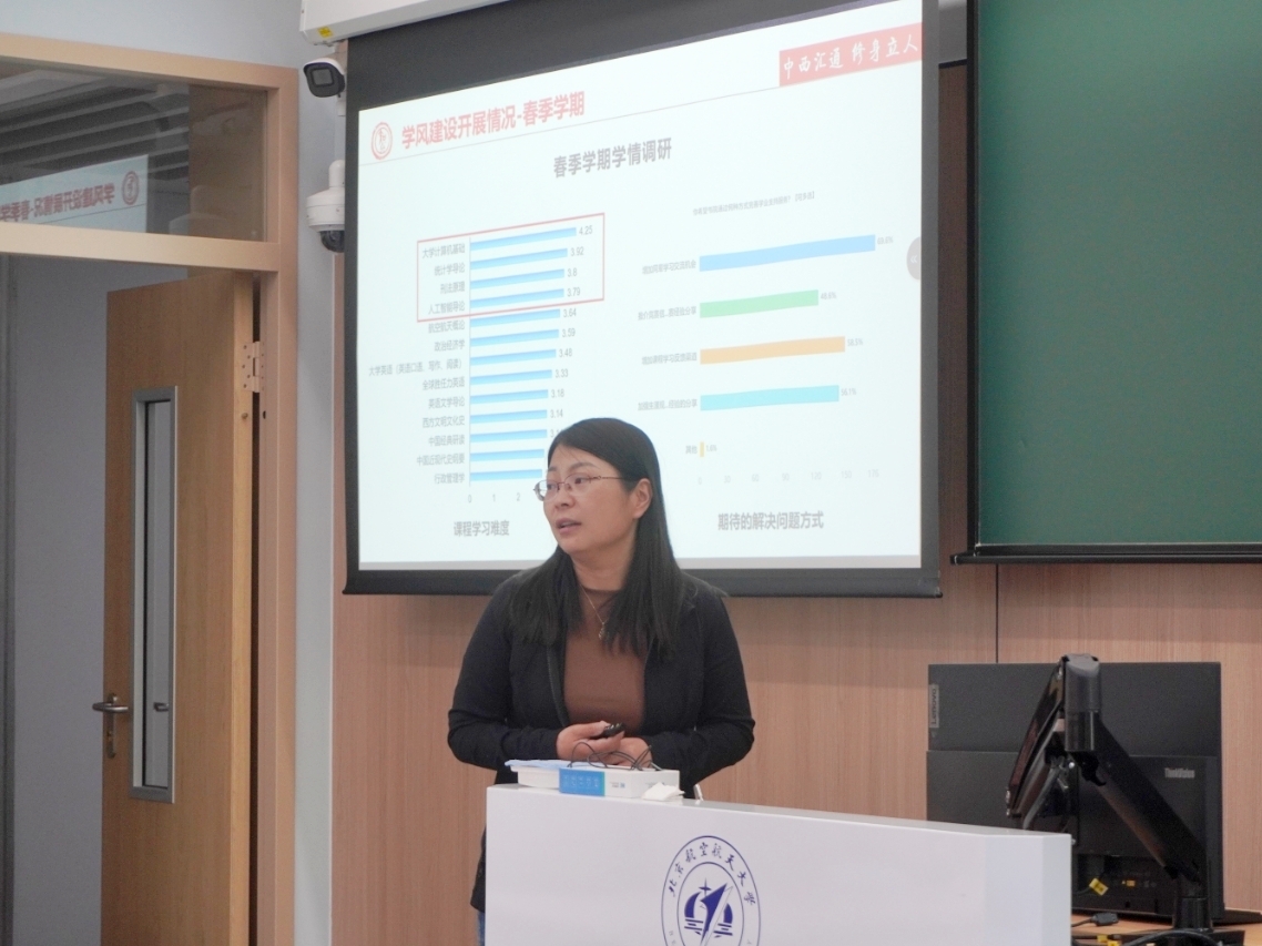 会议伊始,学业助理李玉华老师汇报了悟空影院 春季学期学风建设情况,内容包括学业支持工作体系建设方案、学风建设开展情况以及本学期工作安排。本学期悟空影院 学业与发展支持中心继续依托“三阶段—两层次—一贯通”的学业支持体系,开展了集体自习答疑串讲、最美笔记大赛等学业支持活动,开发了《统计学导论》AI智能答疑系统,为打造悟空影院 优良学风提供了强有力支撑。