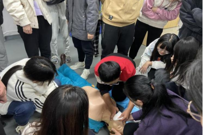 随后,卢艳老师详细地介绍了心脏复苏的基本流程,强调“黄金五分钟”的重要性,并利用人体模型进行演示,在同学们基本了解急救步骤后,卢艳老师让同学们上台亲自实践,并进行现场指导教学。整场讲座气氛热烈,同学们全神贯注,踊跃参与。