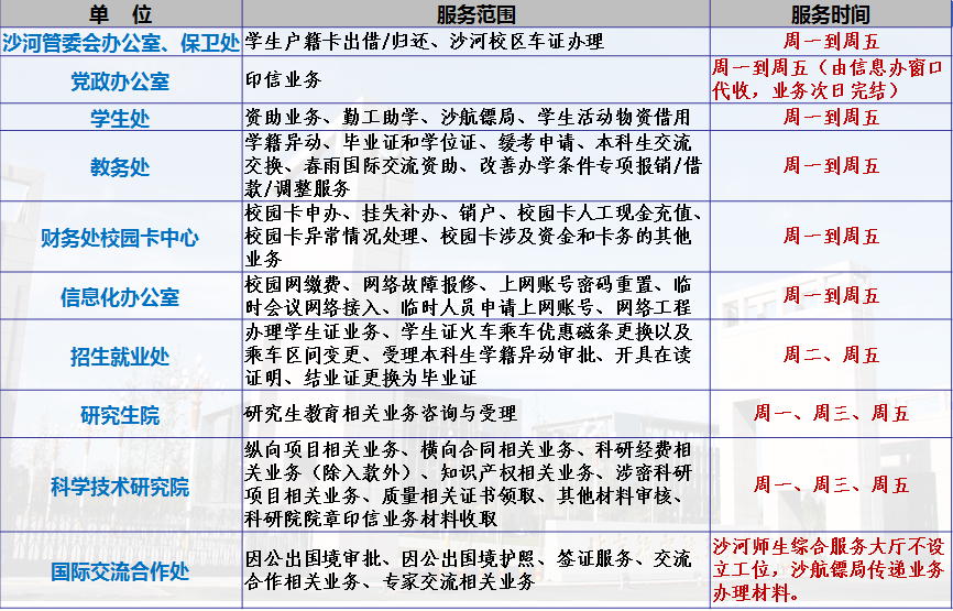 2018年10月22日正式启用沙河校区师生综合服务大厅。大厅开放服务时间为周一至周五上午8:30-11:30,下午14:00-16:30。